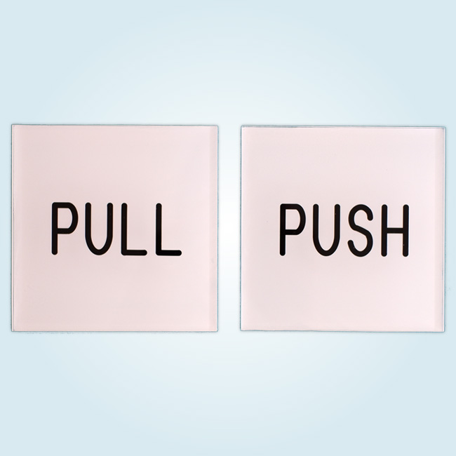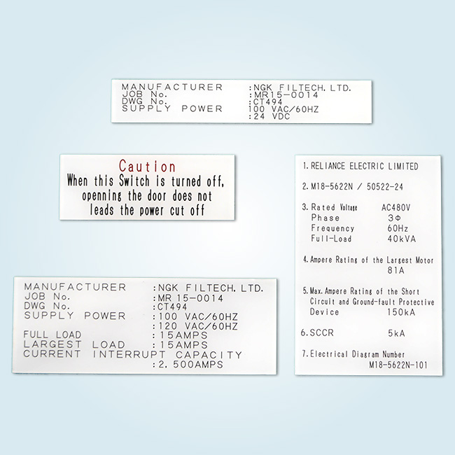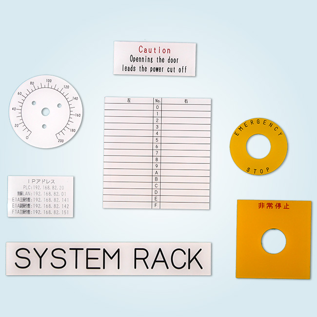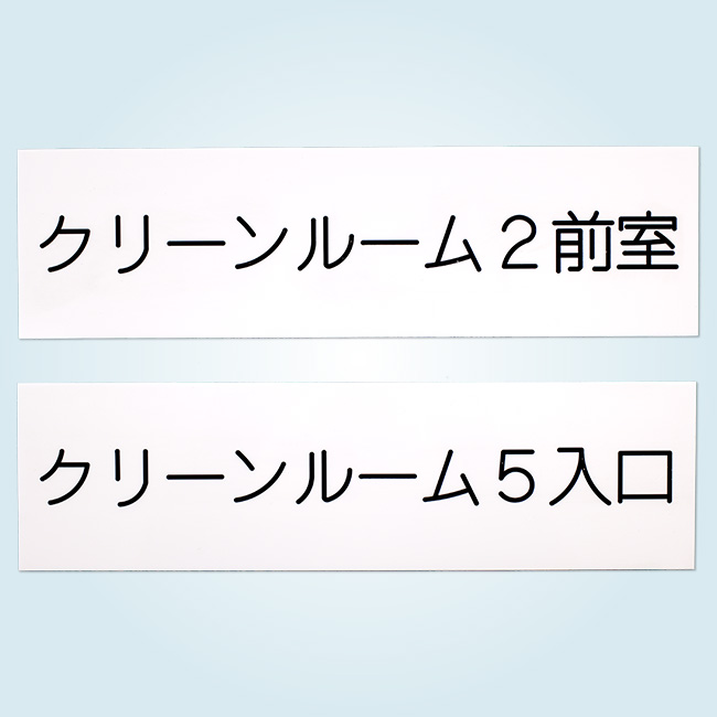 透明のアクリル板を指定の寸法にカットし、板の裏から、機械彫刻で文字を掘り黒色のインクを充填し、その後、裏面を白く塗装しました。