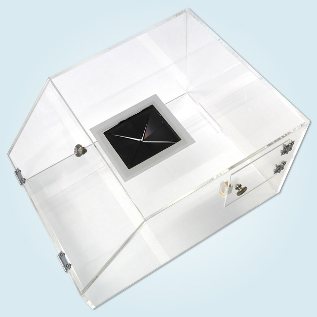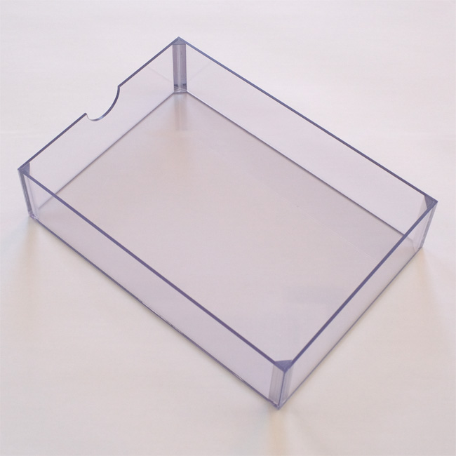 アクリルの板を加工し、取っ手部分は半円に切り込みを入れ、指が引っかかるように加工しました。 角の部分には三角棒をカットし、強度の補強のために取付を行いました。 アクリル板どうしはアクリル専用の接着剤で接着してあります。
