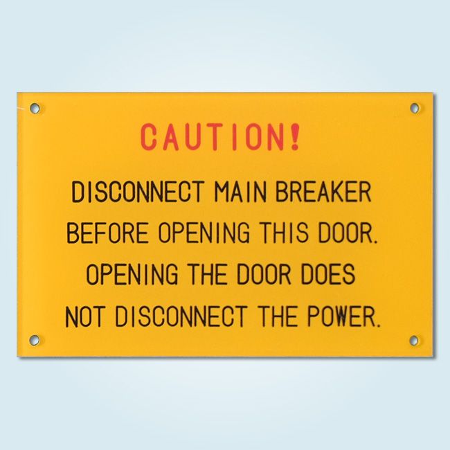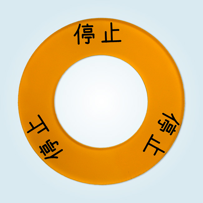 透明の板に裏からシルク印刷を行い、裏面を黄色に塗装しました。 裏側にシルク印刷を行うため、逆字のシルクの版を作成し印刷をしてあります。 矢印部分は、機械彫刻だと角が丸くなってしまいますが、シルク印刷だとデザイン的に角を出す事が出来る為シルク印刷をセレクトしました。