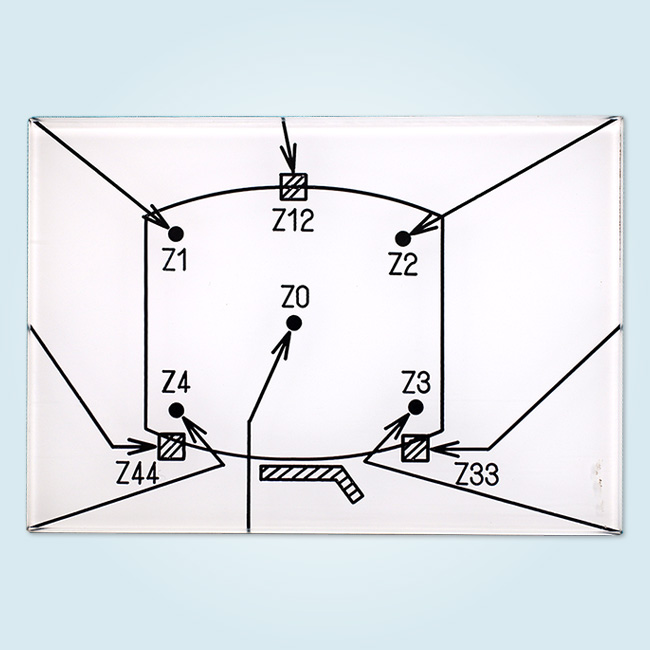 透明なアクリル板をカットし裏から文字とラインを彫刻します。写真のような複雑なデザインも母型を作成することで機械彫刻で対応可能です。