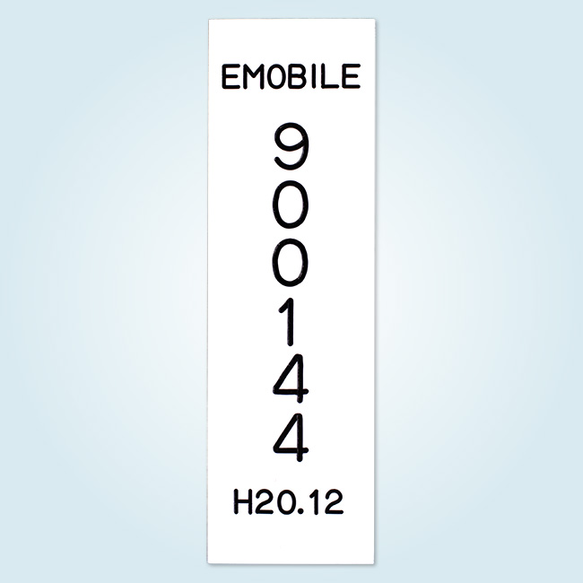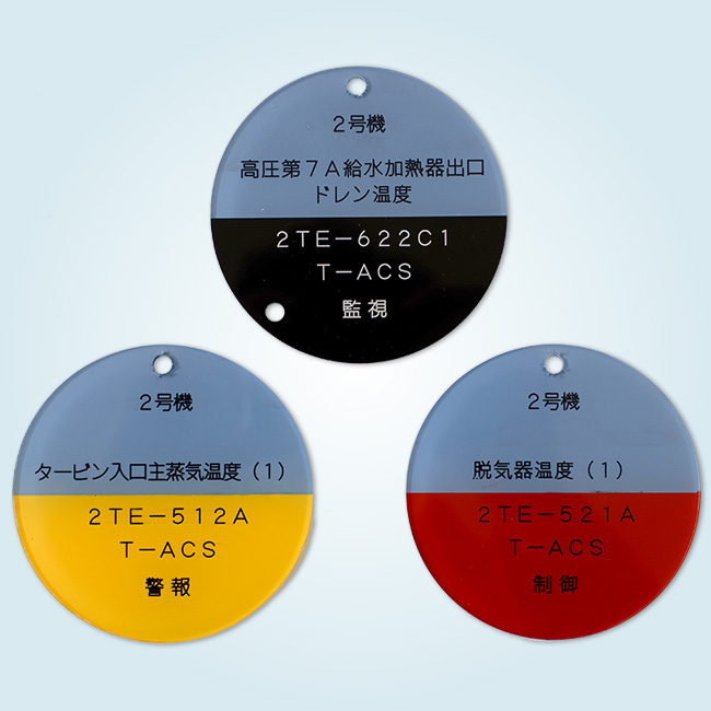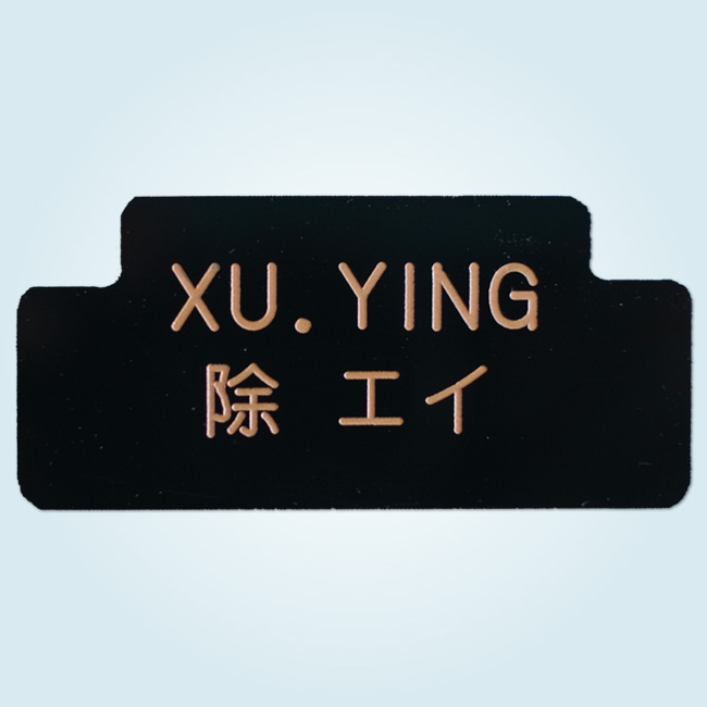 白いアクリル(骨白)を使用し、表から機械彫刻で文字を掘り、黒色を充填しました。