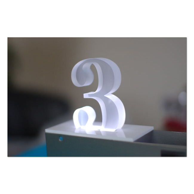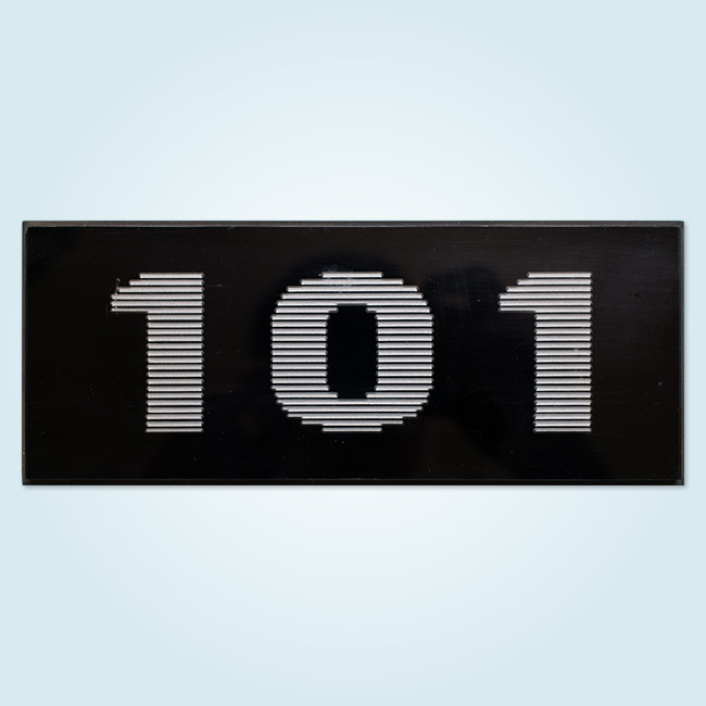透明のアクリル板をカットし、板の裏から、機械彫刻で文字を長体に掘り黒色のインク充填し、その後、裏面を白く塗装しました。