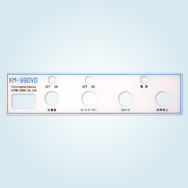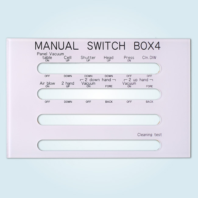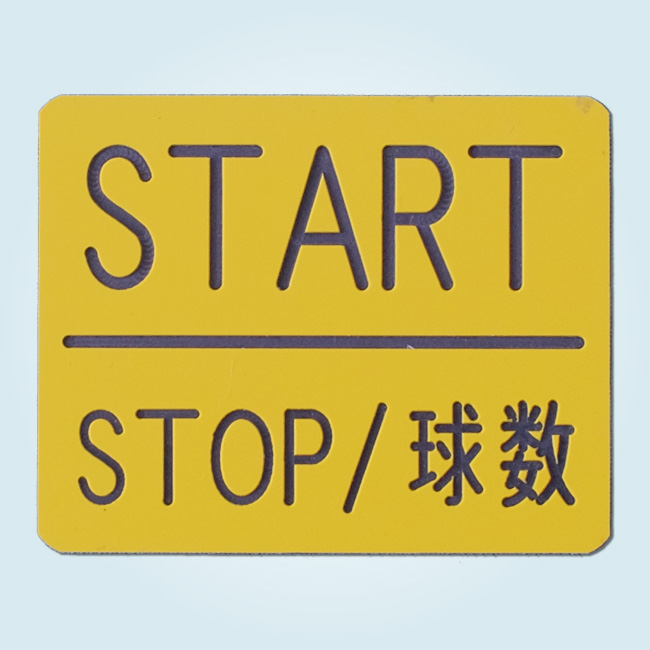 半透明のパープル材を指定の寸法にカットし彫刻機械を利用し穴加工を行いました。表から文字を彫刻し白の塗料を充填し、最後に後ろから黒でシルク印刷を行いました。この際に、後ろからランプが付いた時にランプの点灯がわかるようランプが点灯する丸い部分だけ印刷しないように致しました。