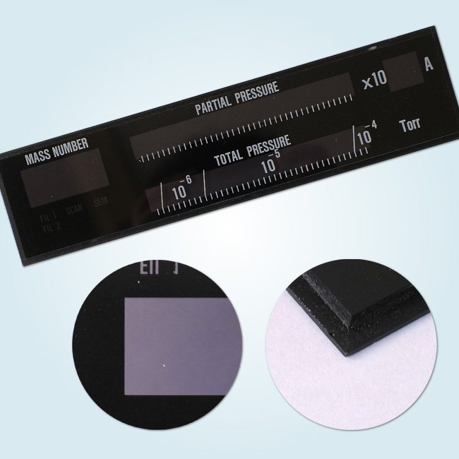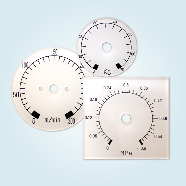 透明のアクリルに、裏面は黒で印刷、表面はメモリや文字を白でシルクスリーン印刷をしました。