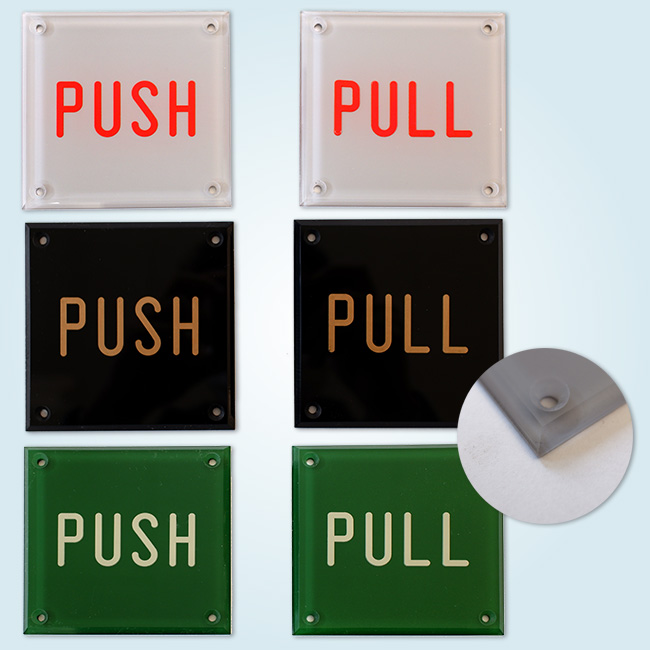 透明のアクリルに裏側から厚めに黄色のインクを塗り、文字や枠部分を裏彫りし、そこに黒のインクを裏から吹き付けて塗装します。 最後に、両面テープを裏側に貼って完成です。