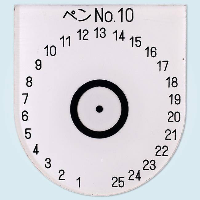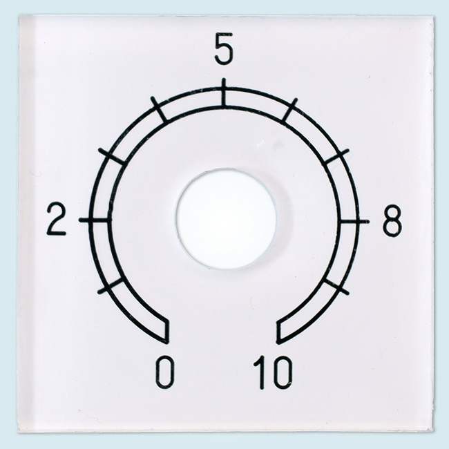 透明のアクリル板を、丸くカットし穴あけ加工を行い、裏から機械彫刻で文字とメモリを掘ります。 黒色のインクを充填した後に裏から白の塗料で塗装しました。