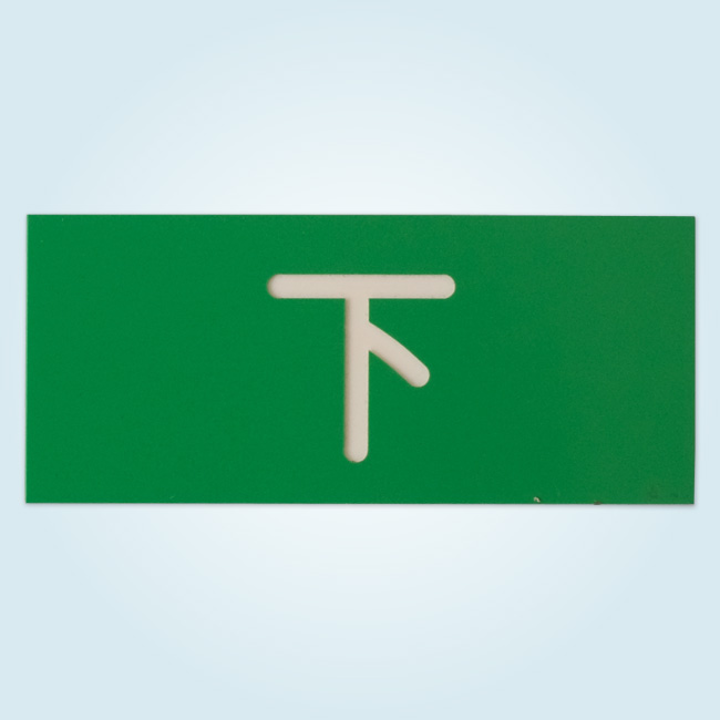骨白の上にグリーンがコーティングされたアクリルの板を、既定の寸法にカットし、文字の部分を機械彫刻で彫刻します。 グリーンの部分だけを薄く彫刻し、骨白部分を表出させて、文字を表現しています。