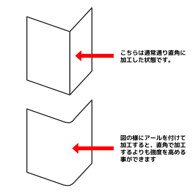 板金に使用する板は下図の様に直角で曲げるよりも多少アールを付けることによって強度を高めることができます。