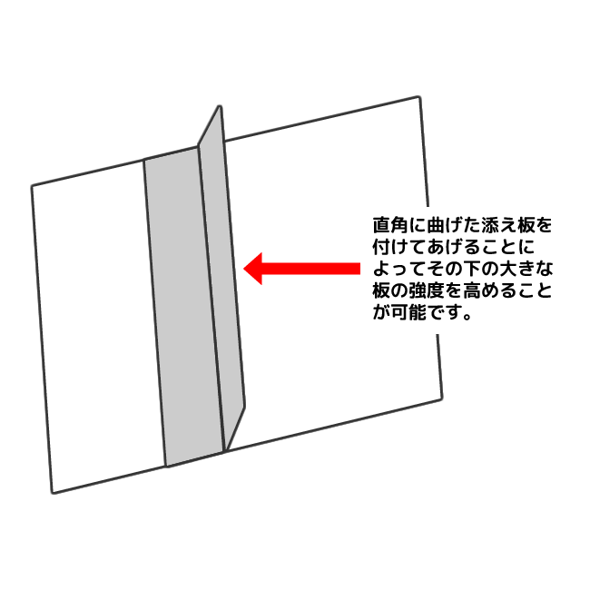 大きな板を使用する場合、その板の所に、直角に曲げた添え板を当ててあげることによって板の強度を高めることが可能です。