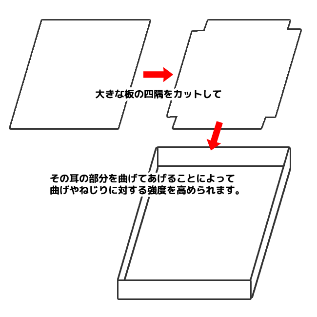 大きな板を使用する場合、その四隅を少し曲げてあげることによって曲げやねじりに対する強度を高めることができます。