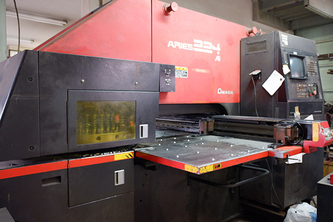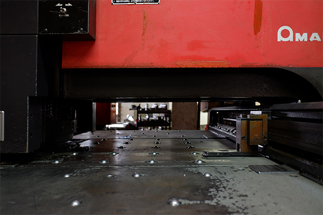 アルミや鉄、ステンレス等の板を様々な形にカットする機械です。CADでデータを作成し、その形にタレットパンチプレスが加工作業を行います。タレットパンチプレスでは複雑な形の加工も可能で、例えば、シャーシなどの板金製品の外形加工から穴あけ加工等まで一度に行なう事ができます。ひとつの大きな板に、いくつもの製品を一度に加工することも可能で、大量生産にも向いています。