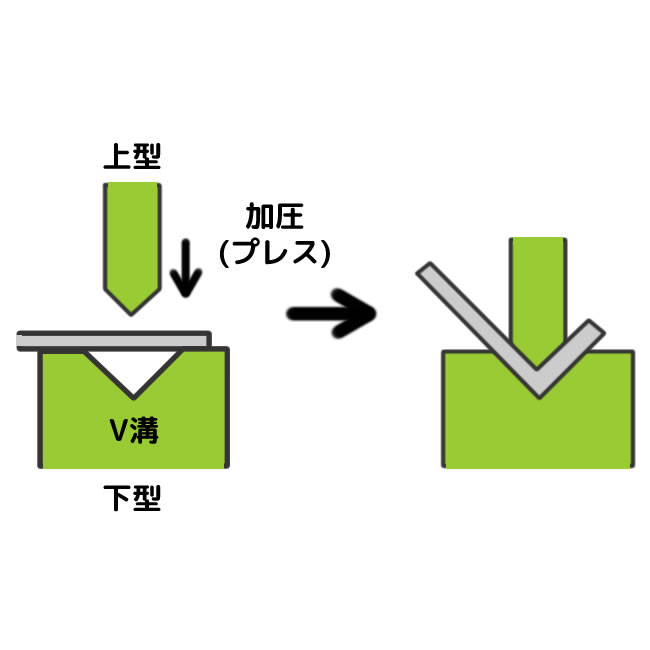 アルミや鉄、ステンレスなどを曲げる為の機械です。板の下にV溝(下型)とを当て、その上からパンチ(上型)で抑える事によって板を曲げる事ができます。(下図参照) V溝とパンチの角度を変える事によって曲げる角度を変えることも出来ますし、アールが付いたV溝とパンチを使用する事によって、角にアールをつけることも出来ます。
