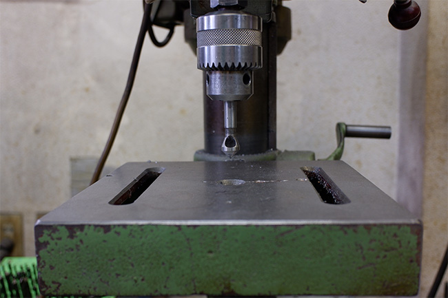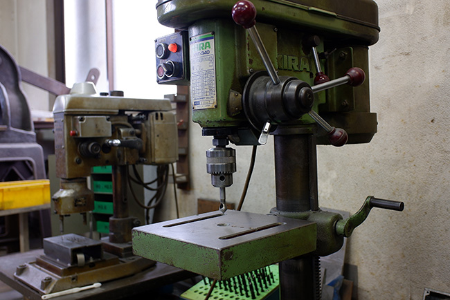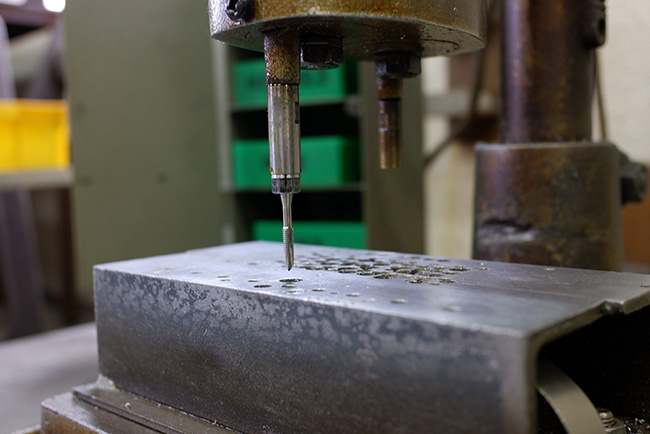 ボール盤は、基本は穴をあける機械です。タレットパンチプレスでも穴あけができますが、数が少ない場合は、ボール盤を使用することがあります。厚みのある素材の場合は、タレットパンチプレスだと穴があけられない場合があるので、その場合はボール盤を使用します。その他、皿もみ加工もボール盤を使用して行う事ができます。