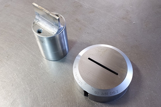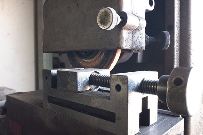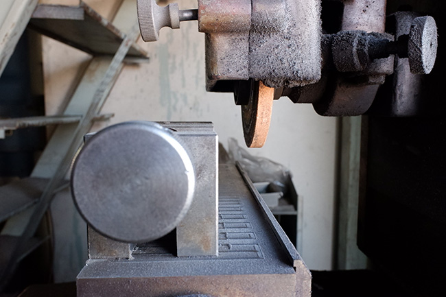 タレパンの金型を研磨する為の機械です。タレパンは、オス型とメス型をセットし、オス型を上から打ち抜くことによって穴を空けていく機械ですが、使用しているうちにメス型の角が削れてアールが付いてきます。アールがついてしまうと切れ味が悪くなってしまう為、メス型の表面を削って直角が出るように削ります。