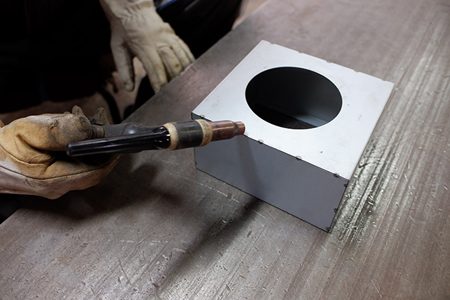 タレパンで加工した際に、どうしても出てしまう切アルゴンガスで溶接したい素材を溶かすことによって、溶けた部分同士が接着されます。 辺と辺を溶接する時の様に、比較的溶接する範囲が大きな時に使用します。 吾妻工業では、アルミと鉄の溶接に使用しています。