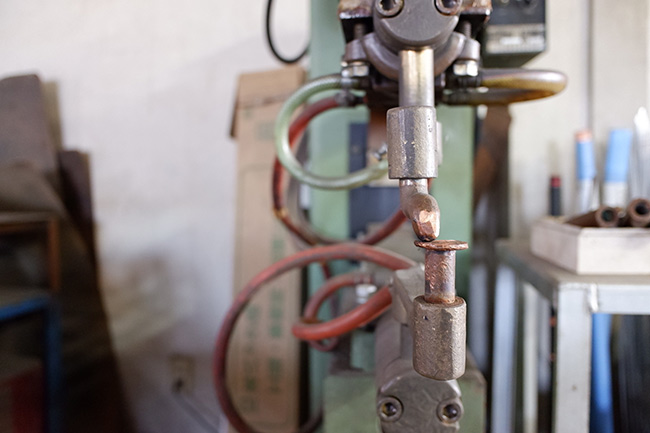 プラスとマイナスの電極を溶接したい部分の上下から押し付ける事によって溶接を行います。